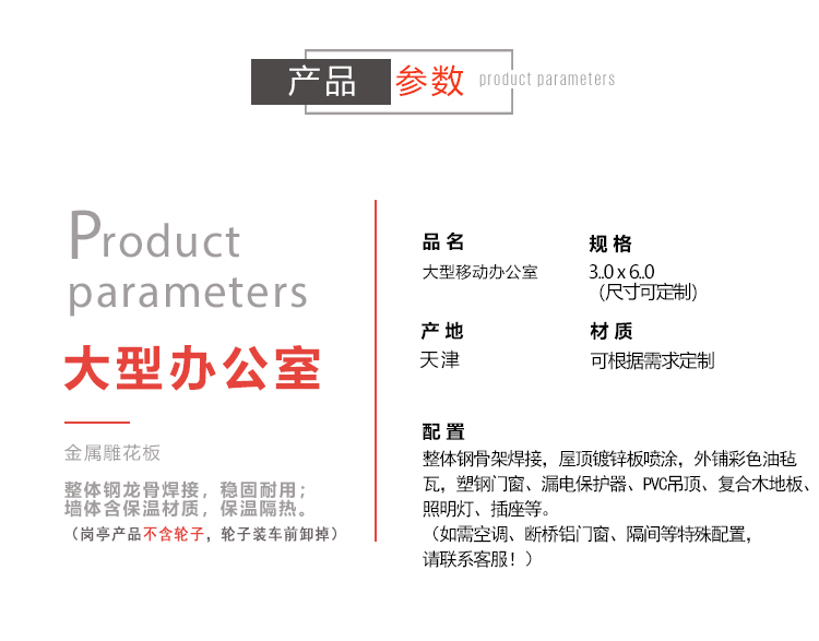 配置:整體鋼骨架焊接,屋頂鍍鋅板噴涂,外鋪彩色油氈瓦,塑鋼門窗、漏電保護(hù)器、PVC吊頂、復(fù)合木地板、照明燈、插座等。(如需空調(diào)、斷橋鋁門窗、隔間等特殊配置請聯(lián)系客服!)