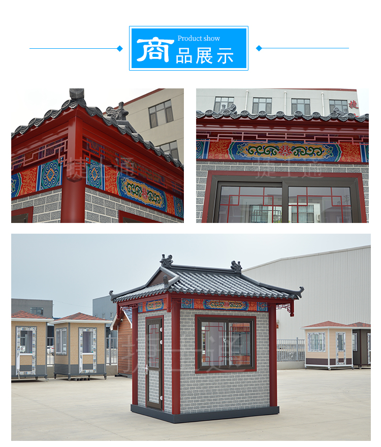 特有的造型,仿古的花紋,創(chuàng)意的窗飾,與古建筑恰到好處的融合,仿古的景區(qū)、仿古的公園、仿古的景點(diǎn),保安崗?fù)?、售票亭、休息亭均可采用此類風(fēng)格,而且在設(shè)計(jì)的時(shí)候,尺寸均可定制?。。?!運(yùn)輸怎么解決?捷士通廠家和全國的物流均有合作,所以只要您在中國,均可運(yùn)輸?shù)剑。?br />